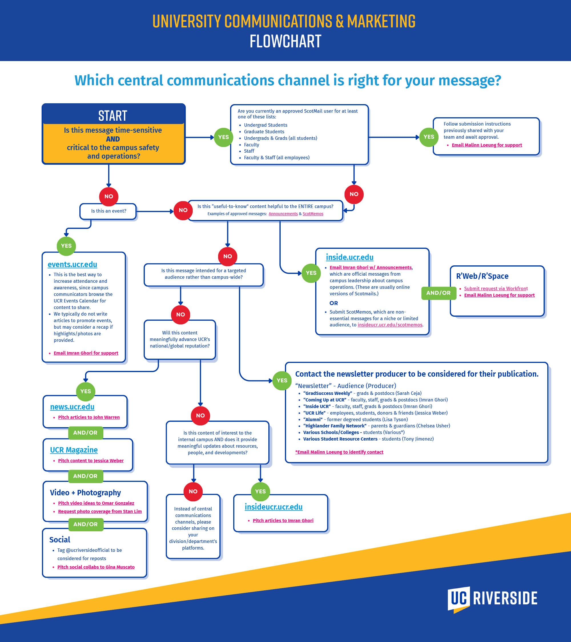 UC Riverside manages several central communications channels/platforms — many of which can be used by all campus communicators. Use the flowchart to find which option is appropriate for your message. More detailed descriptions for each option are available below the flowchart.
